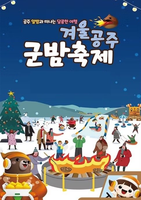 '겨울공주 군밤축제',공주 알밤과 떠나는 달콤한 여행' 공주에서 생산된 지역 농축산물을 그릴위에서 구워 먹을 수 있는 '공주 군밤 그릴존,' 알밤관련 음식, 물품 만들기 체험이 있으며, 추억의 민속놀이 체험, 추억 포토존 등 다양한 볼거리와 즐길거리를 제공합니다. |