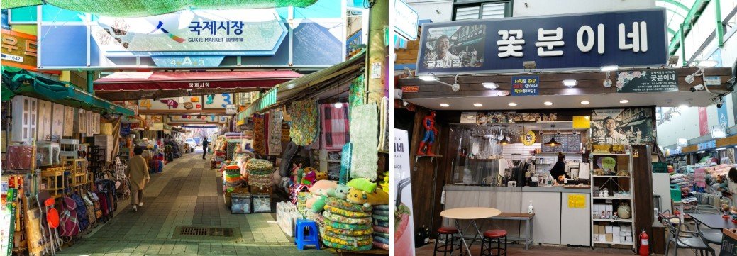 부산 자갈치시장은 자갈치 아지매로 상징되는 한국의 대표적인 어시장으로 부산의 관광 명소 중 하나이며, 회를 비롯한 다양한 해산물을 만날 수 있습니다. 국제시장은 6.25 전쟁이 터지고 부산이 임시수도로 지정되면서 전쟁에서 안전한 유일한 곳이 되자 전국에서 엄청난 피난민과 미군 구호물자, 밀수품이 부산항으로 유입되었고 부족한 시절에 국제시장은 구호품을 빼돌려 팔면서 그야말로 뭐든지 구할 수 있는 곳이 되었다. 외제품을 주로 취급하던 흔적은 지금도 이웃인 깡통시장 등에 남아있습니다 |
