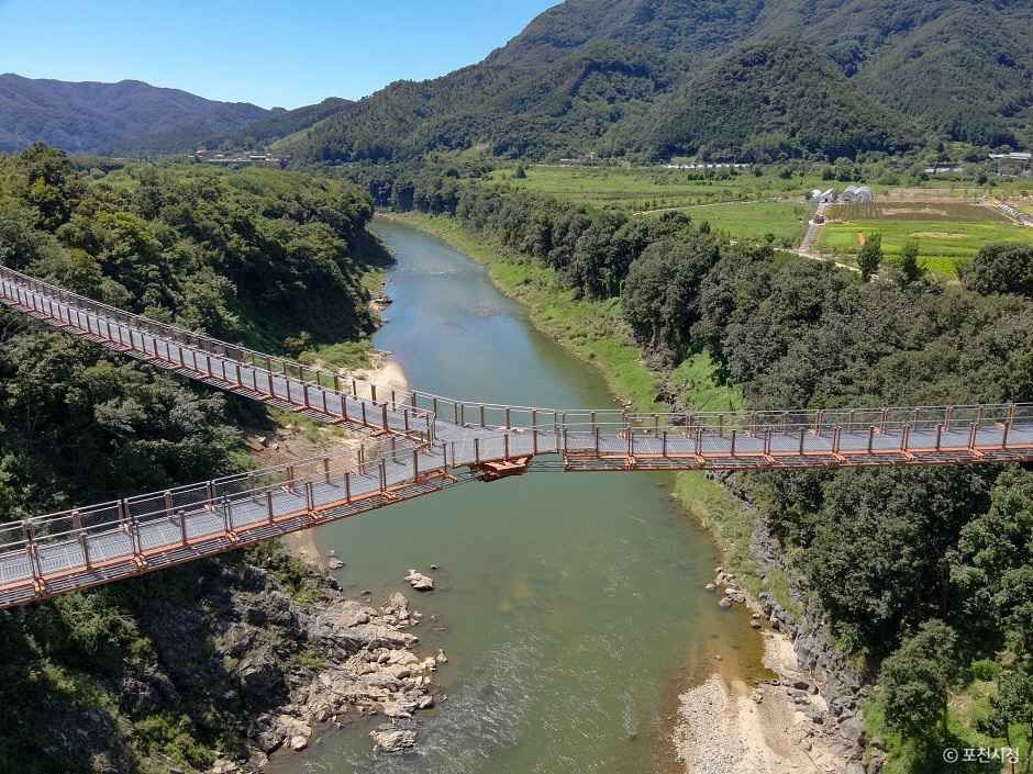 2024년 9월에 개통된 한탄강 Y자 출렁다리는 국내 최장 410m로 비둘기낭 폭포와 한탄강 생태 경관 단지를 연결해 방문객들이 편리하게 오갈 수 있게 해주는 다리입니다. 마치 강 위에 삼발이를 올려놓은 것처럼 세 개의 출렁다리가 가운데로 모이는 모양으로 한탄강 생태경관 단지, 한탄강 하늘다리와 비둘기낭폭포, 가람 누리 전망대 등 3곳에서 다리를 건널 수 있습니다. 또한 2020년 유네스코 세계지질공원으로 지정된 아름다운 한탄강 주상절리 협곡을 관람할 수 있는 최고의 장소로 출렁다리로 가는 길에는 트릭아트 포토존이 있어 즐길 거리를 더해 줍니다. 비둘기낭 폭포