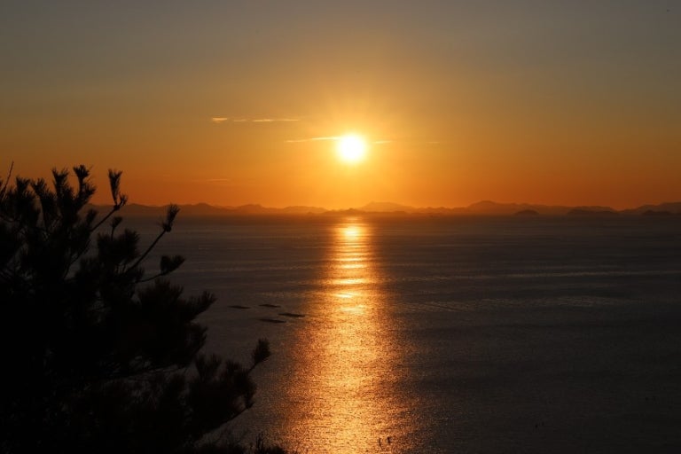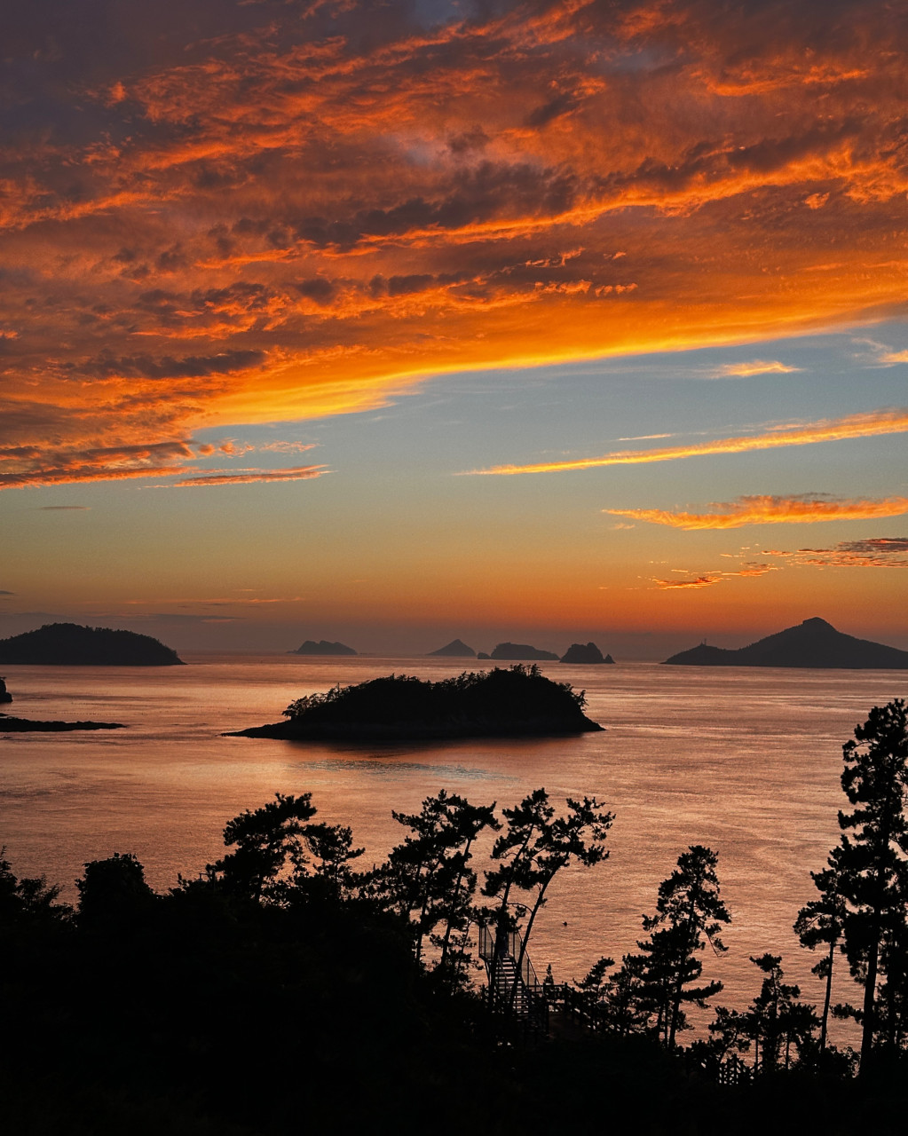 해질 무렵, 섬과 섬 사이로 빨려 들어가는 태양의 장관은