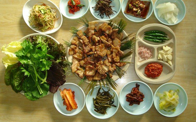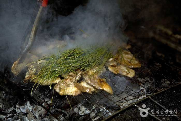 소나무숯불에 석쇠로 구워 기름이 빠진 고기에 솔향기가 스며들어 아주 담백하고 쫄깃쫄깃하며, 한약재료로쓰이는 당귀잎을 싸서 먹으면 쌉쌉한 뒷맛이 향기롭고 개운 합니다. |
