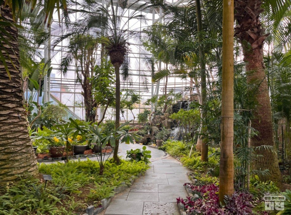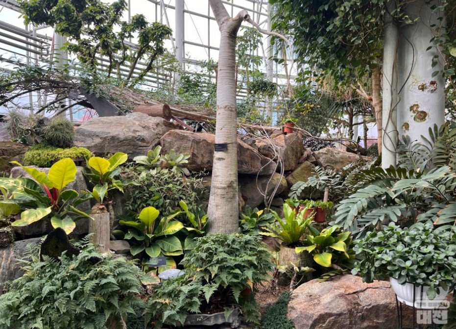 한밭수목원 열대식물원은 맹그로브원, 야자원, 열대화목원, 열대우림원, 열대화과원, 다육식물원 등 6개 주제원으로 구성되어 있으며, 리조포라속 식물을 포함한 약 380여 종의 열대·아열대 식물을 보존·전시하고 있습니다. |