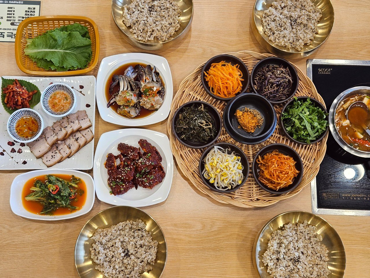 한식 맛집으로, 신선한 간장게장과 양념게장, 쫀득한 감자전이 인기 메뉴입니다. 보리밥과 함께 나오는 된장찌개, 삼겹살 수육도 훌륭하며, 무제한 막걸리와 정갈한 나물 반찬이 제공됩니다. |